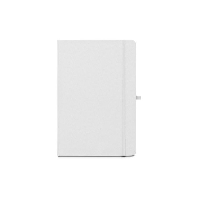 A5-Notizbuch mit festem Einband, ideal für die Sublimationspersonalisierung. Das Notizbuch aus recyceltem 300D Polyester (100% rPET) hat 160 linierte Seiten auf 100% recyceltem elfenbeinfarbenem Papier (70 g/m²), einen Trennstreifen, einen Kugelschreiberhalter (nicht im Lieferumfang enthalten) und einen elastischen Verschluss, in weiß farbe