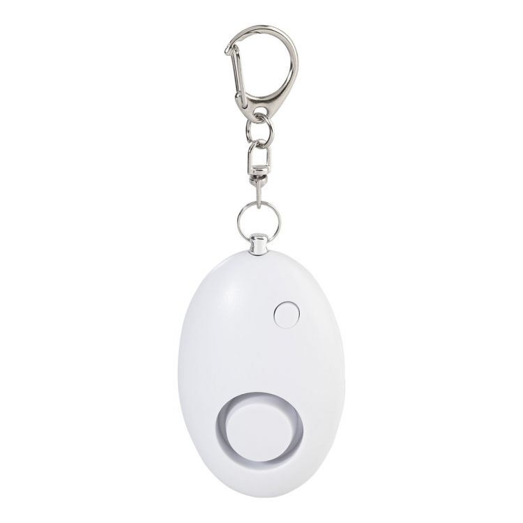 Schlüsselanhänger mit persönlicher Alarm aus recyceltem ABS, mit Karabinerhaken und LED-Taschenlampe. Der Alarm wird durch Ziehen des Sicherungsstifts ausgelöst. Lautstärke: ca. 100 dB. Inkl. Knopfzellenbatterien.