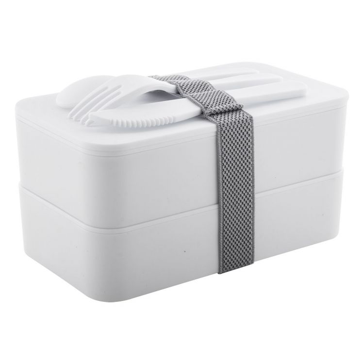Lunchbox aus antibakteriellem Kunststoff mit Besteckset (Gabel, Löffel und Messer) und elastischem Band. Mit 2 Fächern mit je 700 ml Fassungsvermögen. ISO 22196-konform, in weiß farbe