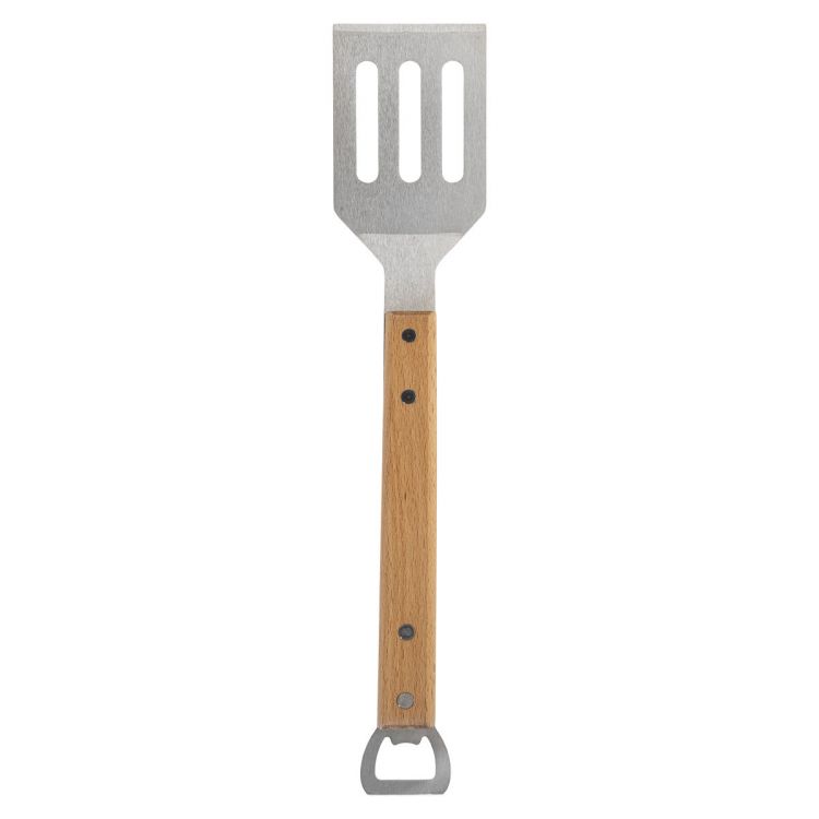 BBQ-Bratwender aus Edelstahl mit Holzgriff und Flaschenöffner