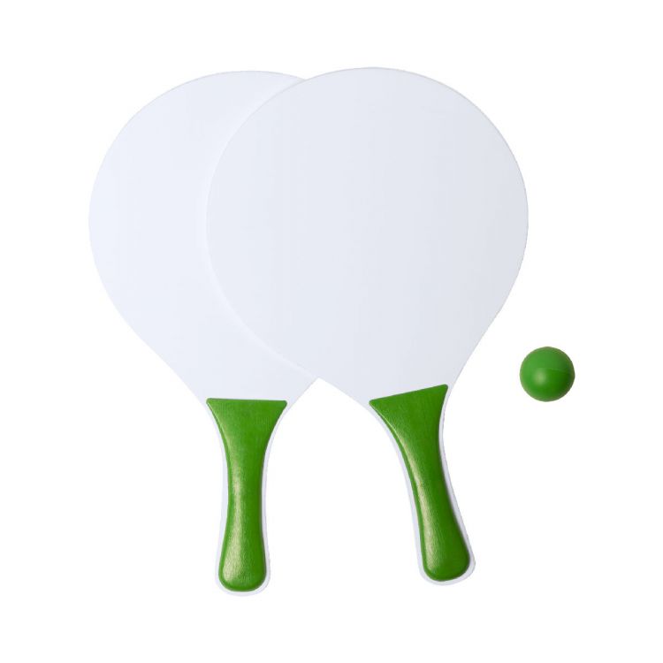 Beachtennis mit 2 großen Schlägern und einem Ball, aus Holz und Kunststoff.