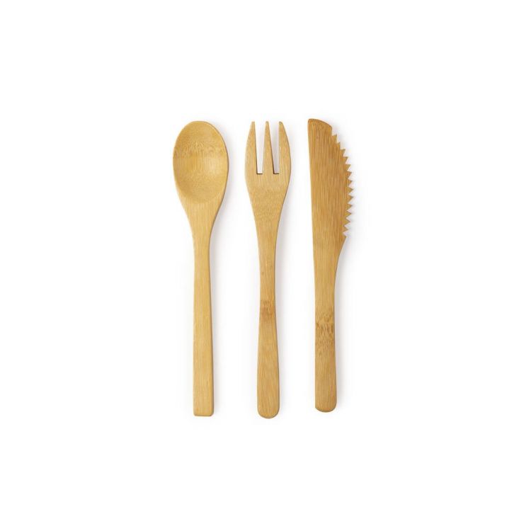 Besteck aus unserer Naturlinie. Inklusive Gabel, Löffel und Messer, hergestellt aus Bambus. Präsentiert in einem Baumwollbeutel mit verschließbaren Schnüren. (natürlich farbe)