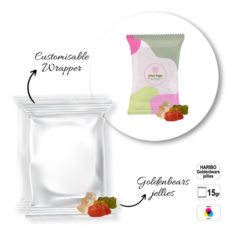 Pralinenschachtel. Die Buchstaben im Produktcode entsprechen der Form der Süßigkeit: A- Haribo Goldbären (15 g), B- Gummibonbons in Himbeerform (verschiedene Geschmacksrichtungen: Traube und Sambuca) (15 g), C- Mini-Buntbonbons Schokolade mit Erdnüssen darin (15 g). Verpackung: vollständig anpassbarer Lebensmittelbeutel mit der Wahl zwischen: 100 % recycelbarem weißen oder transparenten Beutel oder 100 % recycelbarem Kraftpapierbeutel, mit zusätzlicher Lebensmittelfolie auf der Innenseite des Beutels [Kunststoffgehalt in der Verpackung < 65 %], ( Auswahl der Ausführung bei Bestellung). Mindesthaltbarkeitsdatum: 6 Monate.