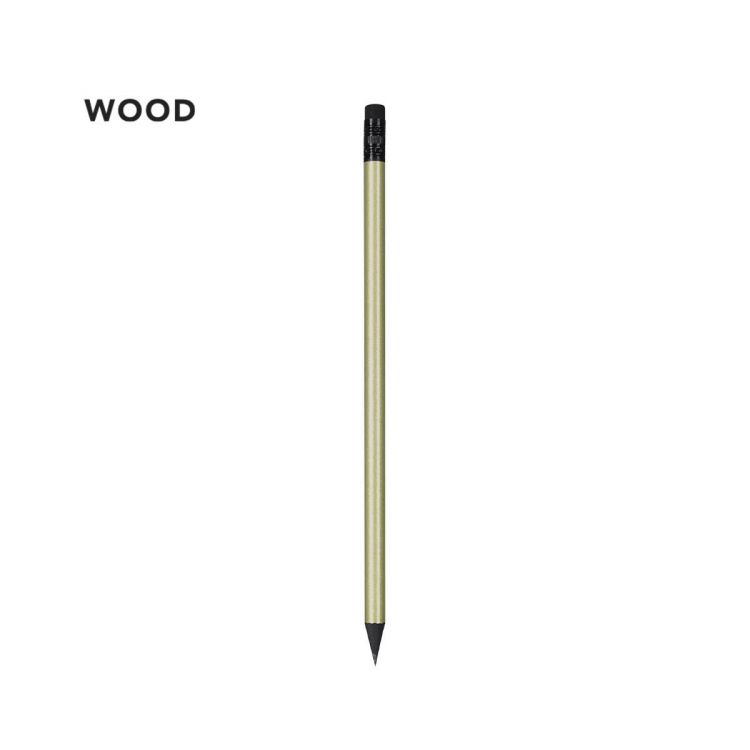 Metallisch gefärbter Bleistift mit schwarzem Inneren aus Holz. Enthält einen Radiergummi in schwarzer Farbe. Mit schwarzer Mine und spitzer Spitze.