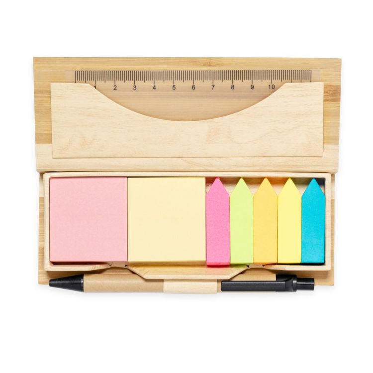 Nützliches Büroset aus Bambus. Diese Box enthält 220 Haftnotizen im Format 4x4,5 cm in zwei Farben, 550 Mini-Haftnotizen in Pfeilform von 1,2x4,5 cm in fünf leuchtenden Farben, ein 12-cm-Lineal und einen Kugelschreiber aus recyceltem Karton mit blauer Tinte. Präsentiert in einer einzelnen recycelten Tasche.