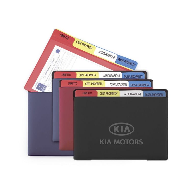 Dokumententasche aus glattem Kunstleder mit vier internen Kunstlederumschlägen (unmontiert geliefert), komplett mit Lasche, bereits mit den Standardaufschriften „Libretto“, „Cert. Eigentum“, ‚Versicherung‘, ‚Grundsteuer‘.
