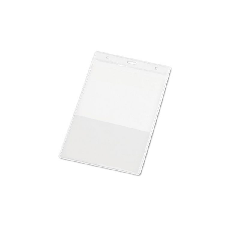 Vertikaler Ausweishalter aus transparentem PVC mit doppelter Tasche (eine der Taschen auf voller Höhe und die andere auf halber Höhe), mit seitlichen Löchern und zentralem Knopfloch.