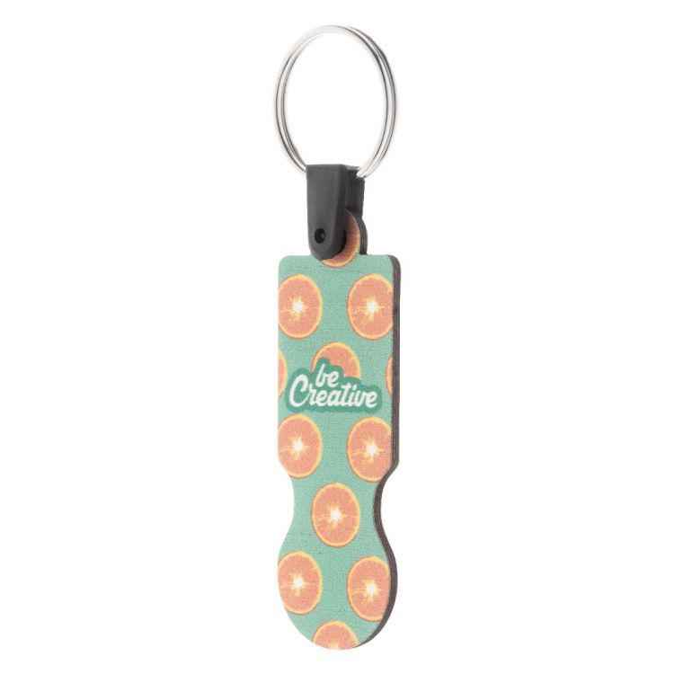Schlüsselanhänger mit Einkaufswagen-Chip aus Sperrholz und Vollfarbgrafik. Der Preis beinhaltet UV-LED-Druck auf einer Seite. Mindestmenge: 200 Stk