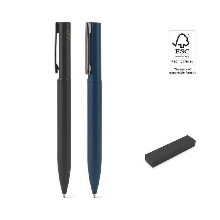 Kugelschreiber aus Metall (60% recycelt), mit einem abgerundeten Design für ein harmonisches Schreibgefühl. Er hat einen Clip, einen Drehmechanismus und eine blaue Mine. Geliefert in einer Geschenkbox aus Kraftpapier, hergestellt aus FSC™-zertifiziertem Material und anderen kontrollierten Materialien