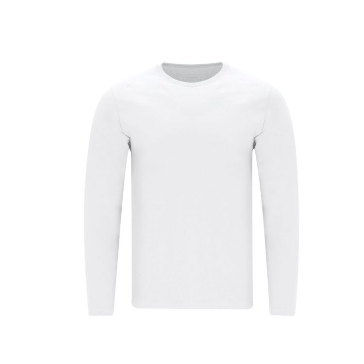 Erwachsenengröße, langärmeliges T-Shirt in Weiß, weich und angenehm im Griff aus 100% Baumwolle, 160 g/m² glatt gestrickt. Hergestellt aus Schlauchware, mit 1x1 geripptem Rundhalsausschnitt und passender, verstärkter Nahtabdeckung in Weiß.