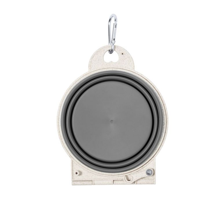 Faltbarer Futternapf aus Weizenstroh. Kompaktes Design, mit zwei Fächern und perfekt für den Einsatz überall. Inklusive praktischem, einfach zu befestigendem Karabiner. Präsentiert in einer einzelnen recycelten Tasche.