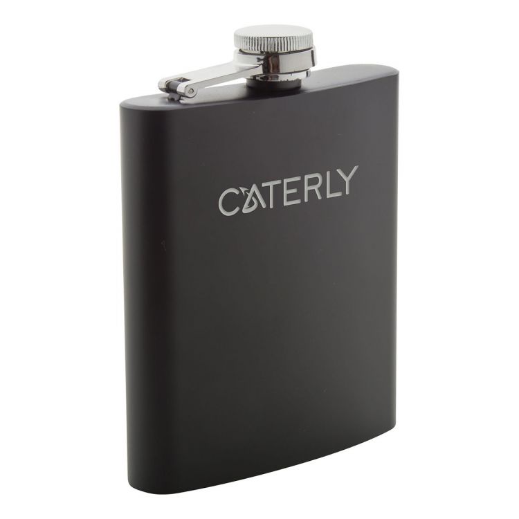 Flachmann aus Edelstahl mit schwarzer Lackierung. Füllmenge: 200 ml, in schwarz farbe