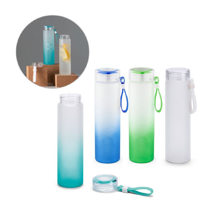 Trinkflasche aus Borosilikatglas mit Schraubverschluss aus AS (470 mL). Diese Flasche hat eine matte Oberfläche mit Farbverlauf und eine Silikonschlaufe am Deckel. Geliefert in einer Schachtel
