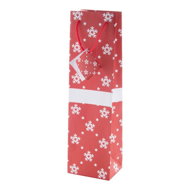 Weinflaschentasche aus matt laminiertem Papier mit Weihnachtsmotiv, weißer Druckfläche und Geschenkanhänger