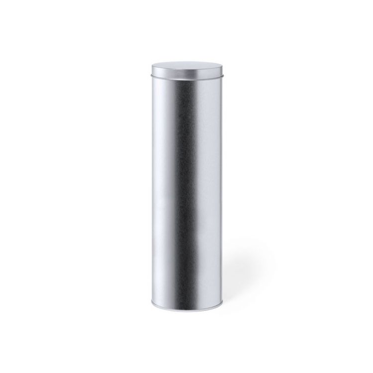 Zylindrische Präsentationsbox aus robustem, silberfarbenem Metall mit passendem Deckel. (silber farbe)