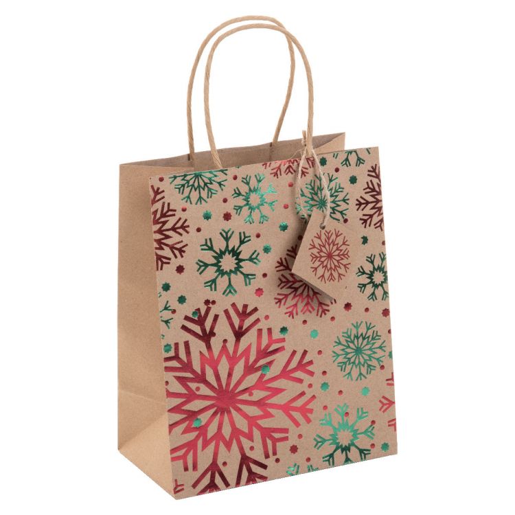 Geschenktasche aus recyceltem Kraftpapier mit Weihnachtsmotiven, Griffen und Geschenkanhänger. Material: 140 g/m²