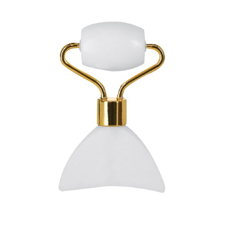 Hochwertige Gesichtsroller aus weißem Jadestein. Angenehmer Handmassager fürs Gesicht, mit einem Gesichtszylinder aus weichem, poliertem Stein und Spatel. (weiß farbe)
