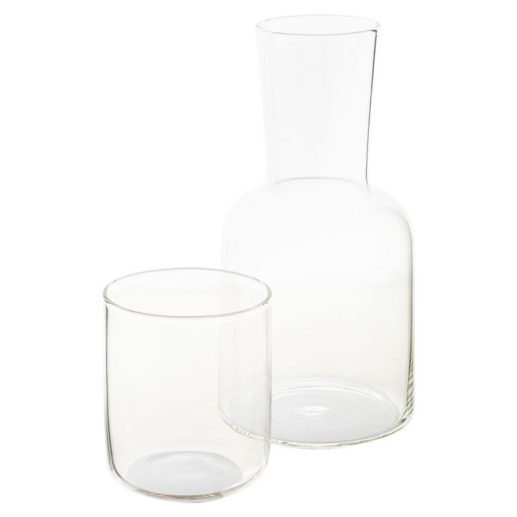 Wasserkaraffe (Füllmenge: 800 ml) und Glas (Füllmenge: 300 ml) aus Borosilikatglas. Geeignet für kalte und warme Getränke, kann auch als Dekanterflasche verwendet werden. Verpackt in Kraftpapierbox, in transparentes weiß farbe