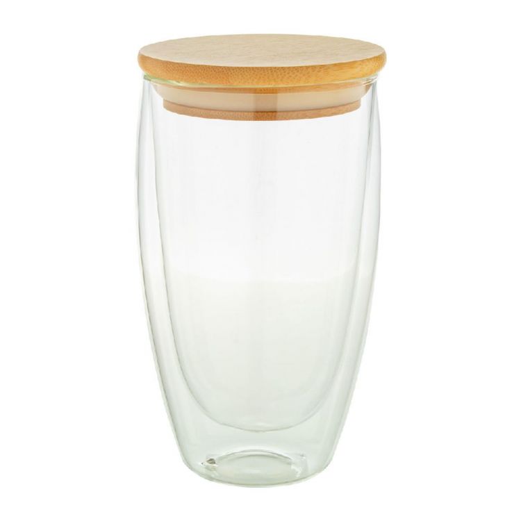 Doppelwandiger Thermobecher aus Borosilikatglas mit Bambusdeckel. Füllmenge: 420 ml. Einzeln in Kraftpapierbox