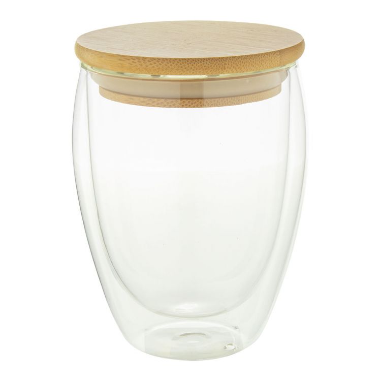 Doppelwandiger Thermobecher aus Borosilikatglas mit Bambusdeckel. Füllmenge: 320 ml. Einzeln in Kraftpapierbox