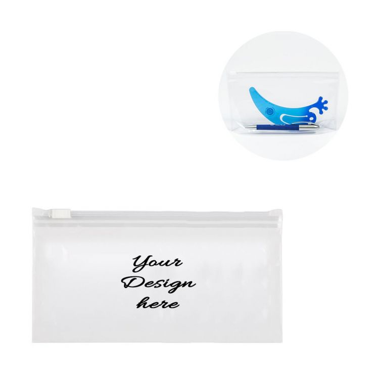 Umschlag aus transparentem PVC, Öffnung an der Längsseite, mit Bodenfalte, Verschlussschiene aus Kunststoff und Kunststoffschieber.