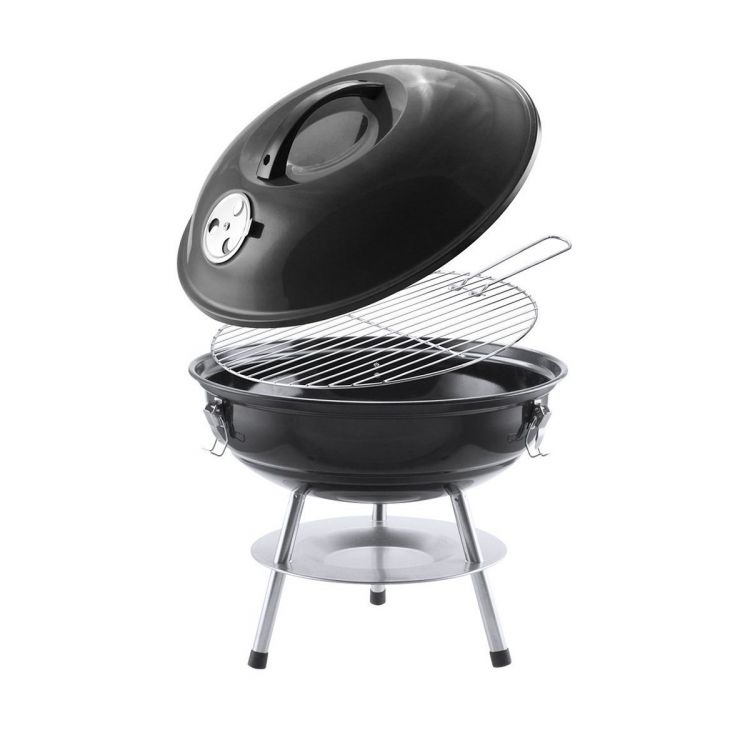 Grill aus widerstandsfähigem Kohlenstoffstahl mit schwarzer Oberfläche. Deckel mit komfortablem Griff und Lüftungslöchern, mit Metallgitter, Tropfschutzplatte und rutschfesten Füßen. Präsentiert in einer attraktiven Designbox. (schwarz farbe)