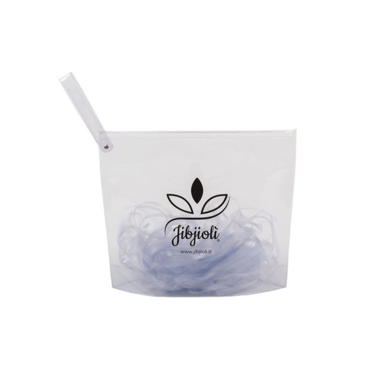Handgelenkstasche groß, aus transparentem Weich-PVC, mit Bodenfalte, Verschlussschiene und Kunststoff-Schieber. Geeignet für Flaschen und kleine Behältnisse.