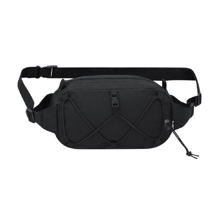 Bauchtasche aus 600D RPET-Polyester. Es hat eine Haupttasche mit einem unsichtbaren schwarzen Reißverschluss, einen schwarzen Metallzug und einen verstellbaren Gurt mit Schnallenverschluss am Riemen. An der Vorderseite befindet sich ein verstellbares Gummiband. Beinhaltet ein unverwechselbares RPET-Label. (schwarz farbe)