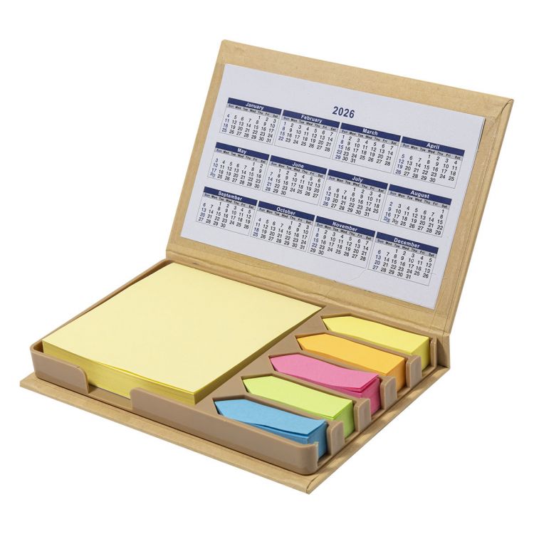 Notizblock aus Recyclingpapier mit 100 gelben Haftnotizen und 500 Seitenmarkern (in 5 verschiedenen Farben). Mit 4-Jahres-Kalender auf der Innenseite des Deckels, in natürlich farbe