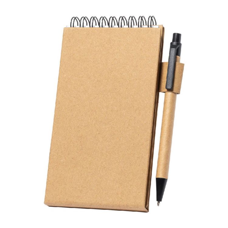 Mit recyceltem Papier überzogener Spiralnotizblock mit 30 linierten Blättern, 25 Haftnotizen und 125 Seitenmarkern (in 5 verschiedenen Farben). Mit Handyhalterfunktion. Inklusive Kugelschreiber aus Recyclingpapier, blauschreibend