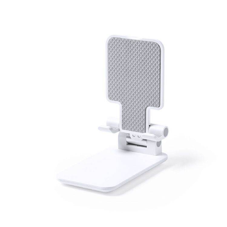 Faltbarer Ständer für Smartphones und Tablets. Höhenverstellbar, inklusive rutschfesten Gummischutz an der Basis und Stütze. In schlichtem Weiß und mit großer Beschriftungsfläche, besonders geeignet für den Tampondruck. Präsentiert in einer attraktiven Designbox. (weiß farbe)