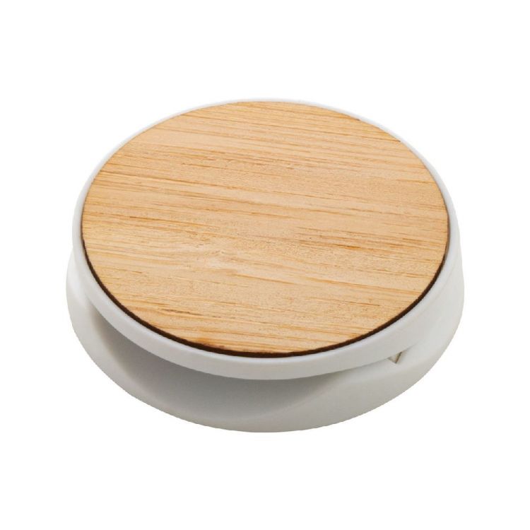 Runder mit Bambus beschichteter Handyhalter aus Kunststoff, mit selbstklebendem Sockel.