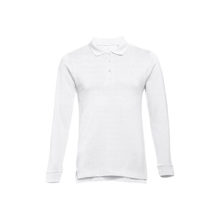 Herren Poloshirt aus Piqué Stoff 100% kardierter Baumwolle (210 g/m²), langarm. Gerippter Kragen und Ärmelbund. Verstärkungsband am Kragen und verstärkte Knopfleiste mit 3 farblich abgestimmten Knöpfen und einem Ersatzknopf an der Innennaht. Unten mit seitlichen Öffnungen, in weiß farbe, Größe 3XL