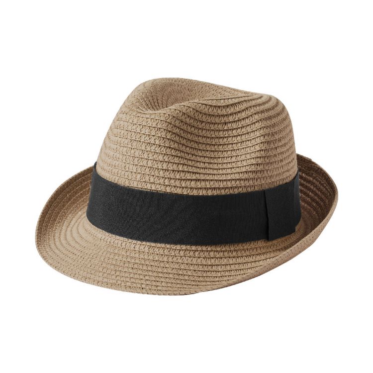 Unisex-Strohhut aus Kunstfaser mit dekorativem Hutband und verstellbarem Innenband.