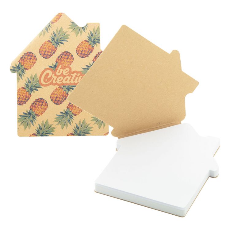 Individueller Haftnotizblock in hausform mit Umschlag aus recyceltem Kraftpapier. Enthält 50 Blatt Haftnotizen aus Recyclingpapier. Im Preis inbegriffen ist der vollfarbig bedruckte Außenumschlag. Mindestbestellmenge: 100 Stück