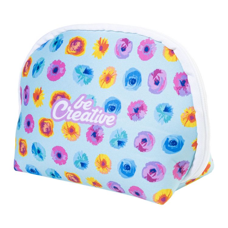 Individuelle Kosmetiktasche mit Reißverschluss aus RPET-Neopren mit vollflächigem Sublimationsdruck. Mit Label RPET. Mindestmenge: 50 Stk.