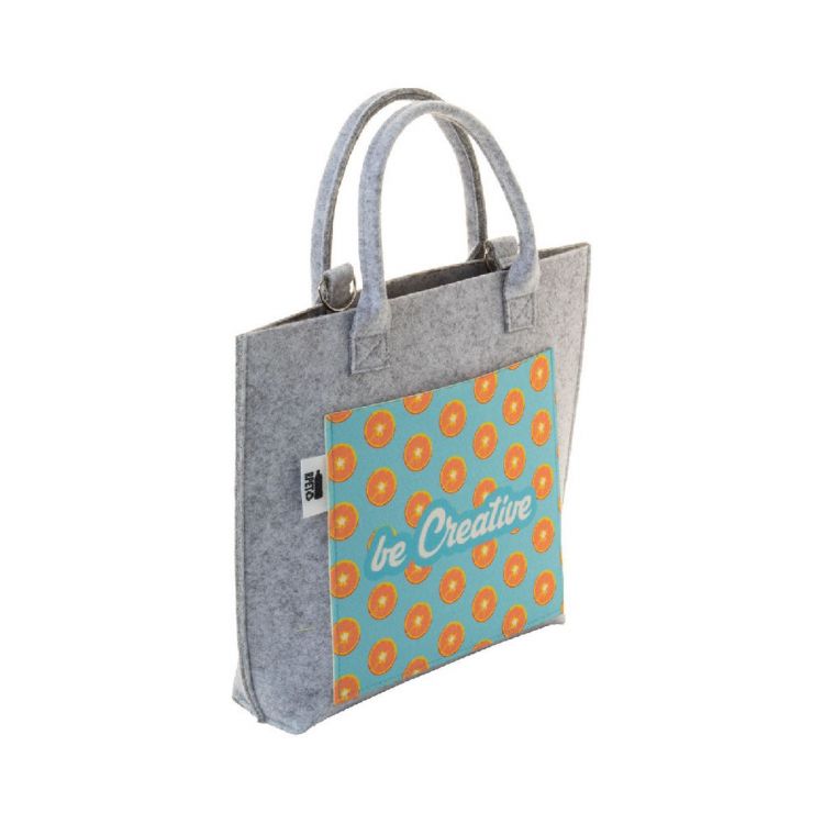 Individuelle Damen-Umhängetasche aus RPET-Filz mit vollfarbig bedruckter Vordertasche. Mit kurzen Henkeln, abnehmbarem Schultergurt und markantem RPET-Label. Der Preis beinhaltet den Sublimationsdruck. Mindestbestellmenge: 25 Stück