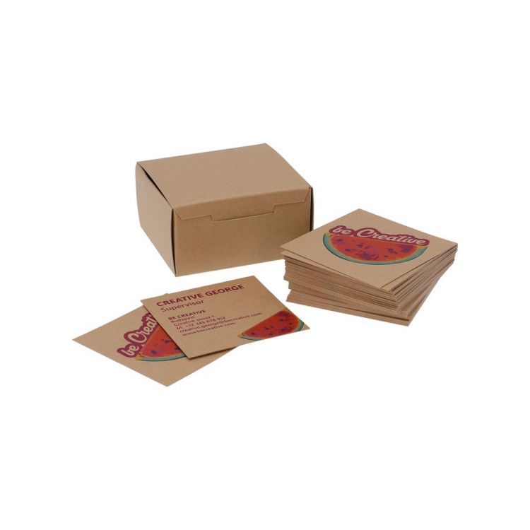 100 Stück maßgefertigte, quadratische Visitenkarten mit beidseitigem Vollfarbdruck. Mattes Kraftpapier, 300 g/m². In Kraftpapierbox