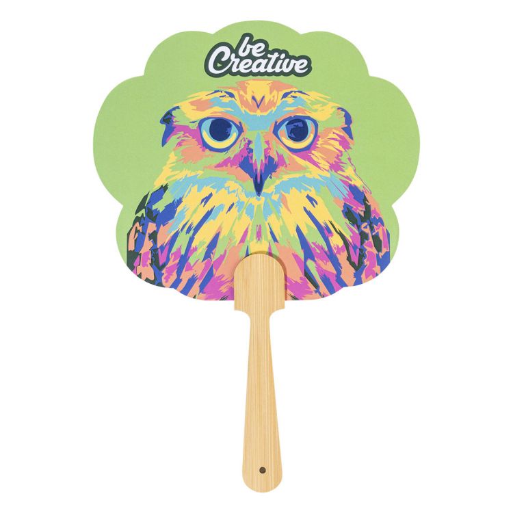 Individueller Handfächer aus laminiertem Papier mit Bambusgriff. Der Preis ist inkl. beidseitigem vollflächigem Digitaldruck. Mindestmenge: 100 Stk