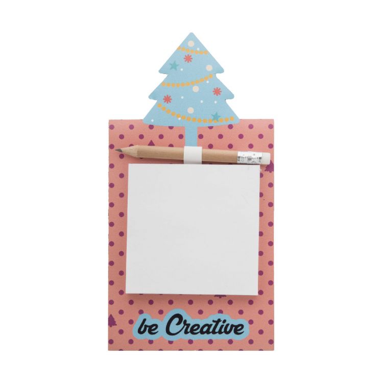Individueller vollfarbig bedruckter Kühlschrankmagnet mit Weihnachtsbaummotiv, Haftnotizblock (75x75 mm) mit 50 Haftnotizen aus Recyclingpapier und Mini-Holzbleistift. Mindestmenge: 100 Stück
