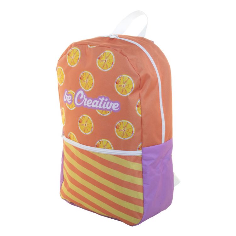 Individueller RPET-Rucksack mit Hauptfach und Vortasche mit Reißverschluss, gepolstertem Rücken und Schultergurten. Mit vollflächigem Sublimationsdruck. Material: 600D RPET-Polyester. Mit RPET-Label. Mindestbestellmenge: 25 Stück.