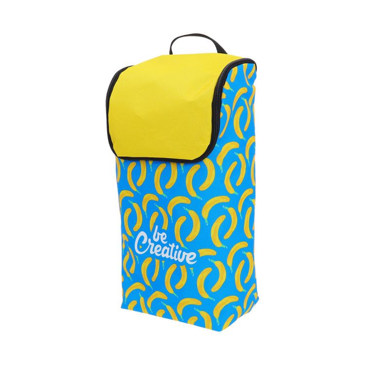 Individueller Reißverschluss-Schuhbeutel aus 600D RPET Polyester (mit RPET Label) mit Tragegriff. Der Preis ist inkl. vollflächigem Sublimationsdruck. Mindestmenge: 25 Stk.