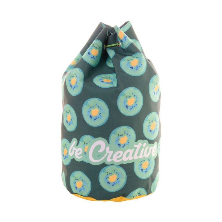 Individueller Kordelzug-Seesack aus 600D RPET Polyester mit farbigen Bändern, RPET-Label und All-Over-Sublimationsdruck. Mindestmenge: 25 Stk.