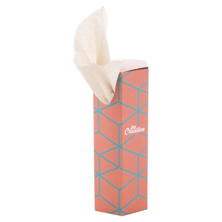 100 Stk. zweilagige Taschentücher aus Recyclingpapier in einem individuellen sechsseckigen Papierspender. Der Preis ist inkl. vollfarbiger Bedruckung auf dem Spender. Mindestmenge: 100 Stk