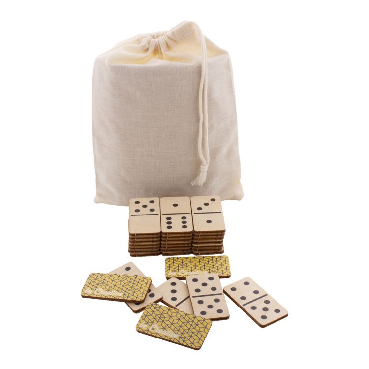 Individuelles Dominospiel aus Birkensperrholz mit 28 Spielsteinen und Tragetasche aus Baumwolle. Der Preis ist inkl. Vollfarbdruck auf der Rückseite von allen Spielsteinen (gleiches Druckmotiv). Mindestmenge: 100 Stk