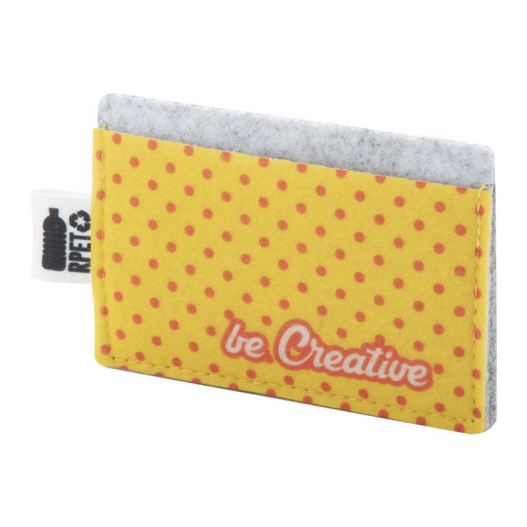 Individuelles Kreditkartenetui mit 3 Kartenfächern aus RPET-Filz. Der Preis ist inklusive vollfarbigem vollflächigem Sublimationsdruck auf der Vorderseite. Mindestbestellmenge: 50 Stk