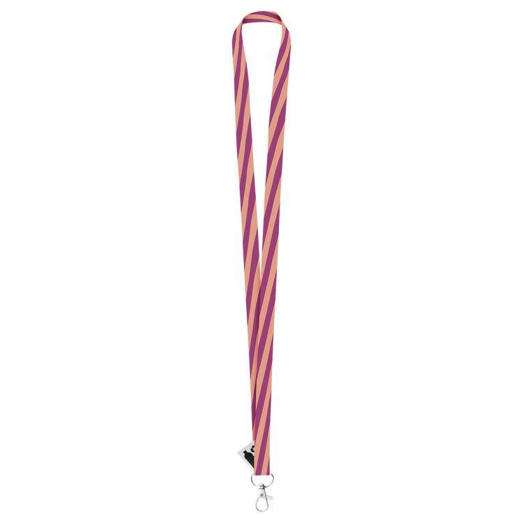 Individuelles Lanyard aus RPET, 15mm breit, mit Metallkarabiner. Der Preis ist inkl. Sublimationsdruck auf beiden Seiten. Mindestmenge: 100 Stk