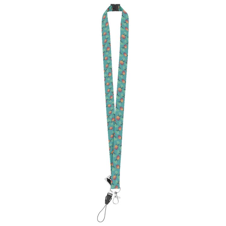 Individuelles Lanyard aus RPET mit Metallkarabiner, Handyfaden und Panikverschluss. Der Preis ist inkl. Sublimationsdruck auf beiden Seiten. Mindestmenge: 100 Stk