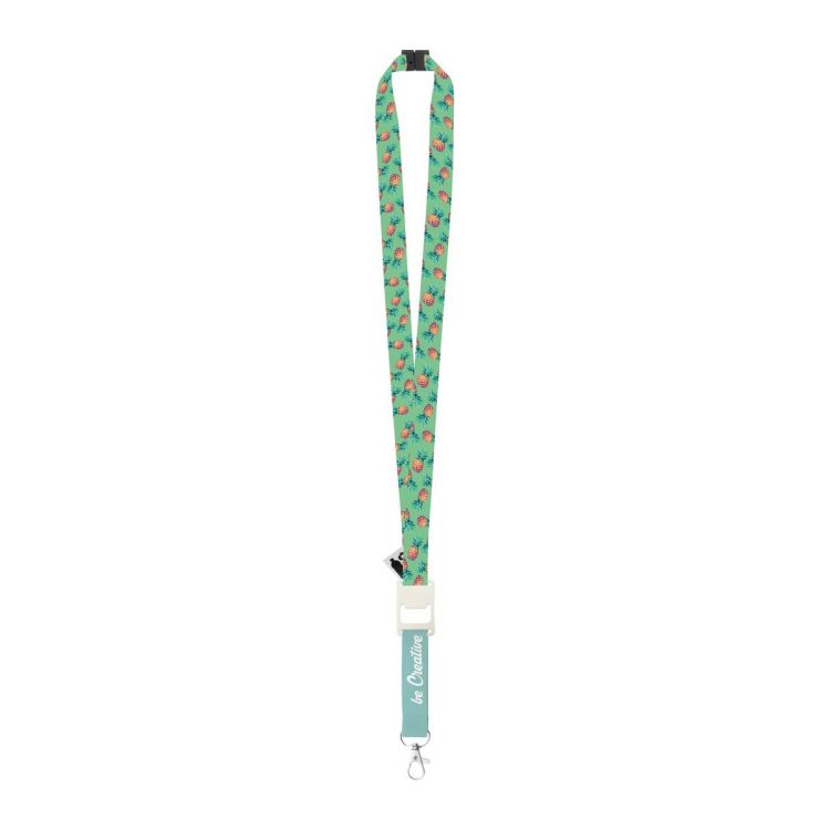 Individuelles Lanyard aus RPET mit Metallkarabiner, Flaschenöffner und Panikverschluss. Der Preis ist inkl. Sublimationsdruck auf beiden Seiten. Mindestmenge: 100 Stk