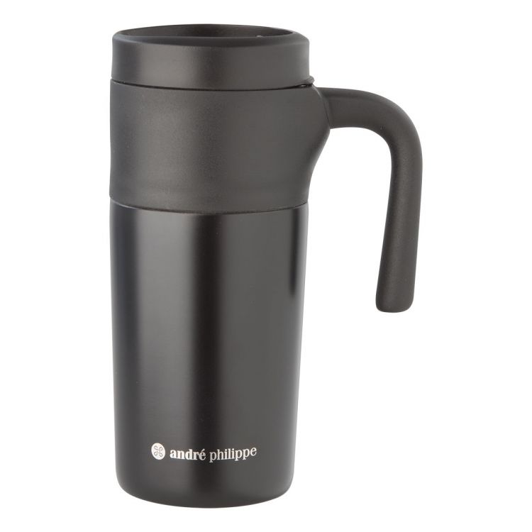 Einwandiger Isolierbecher aus Edelstahl mit Kunststoffdeckel und -griff. Füllmenge: 330 ml. André Philippe Markenprodukt.